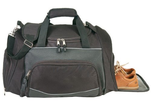 Made of 600D polyester / simulated leather. U-shape main zippered compartment; Two end zippered pockets; One front zippered Adjustable/detachable shoulder strap with shoe storage.Customer Reviews